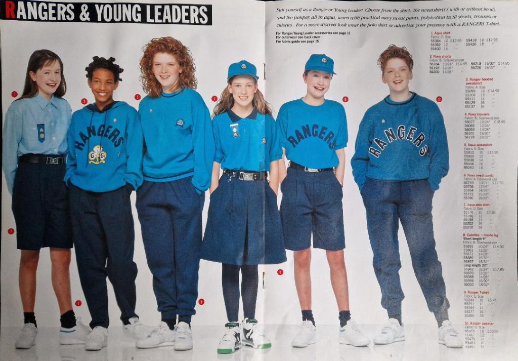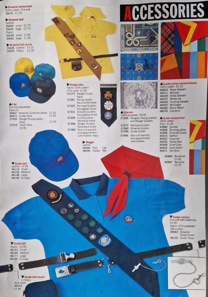 Guides had a slightly wider range of options – the tops were t-shirt, polo shirt, sweatshirt, hoodie, knitted jumper or a long-sleeve shirt in a denim colour. These were worn with a choice of navy trousers, joggers or knee-length culottes. The brown leather Guide belt was retained, as was the unit necker with brown leather woggle. New accessories were the navy badge sash with sash pin and chain, and the Guide blue baseball cap. Again the knitted jumper option wasn’t popular – the sweatshirt was £9.95 or £11.45 dependent on size, the jumper £17.95 or £20.65.