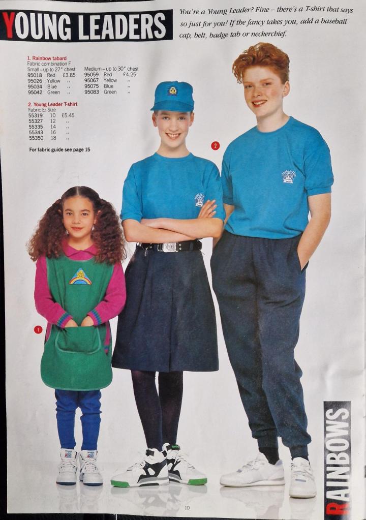 Rainbows, on the other hand, missed out entirely. Having only been introduced three years earlier, in 1987, they continued to have the tabard, with units having the choice of red, green, blue or yellow. It was only some time later, after much campaigning, that a green baseball cap was added to the range as an option for Rainbows, and that purple and orange were added to the range of tabard colours.