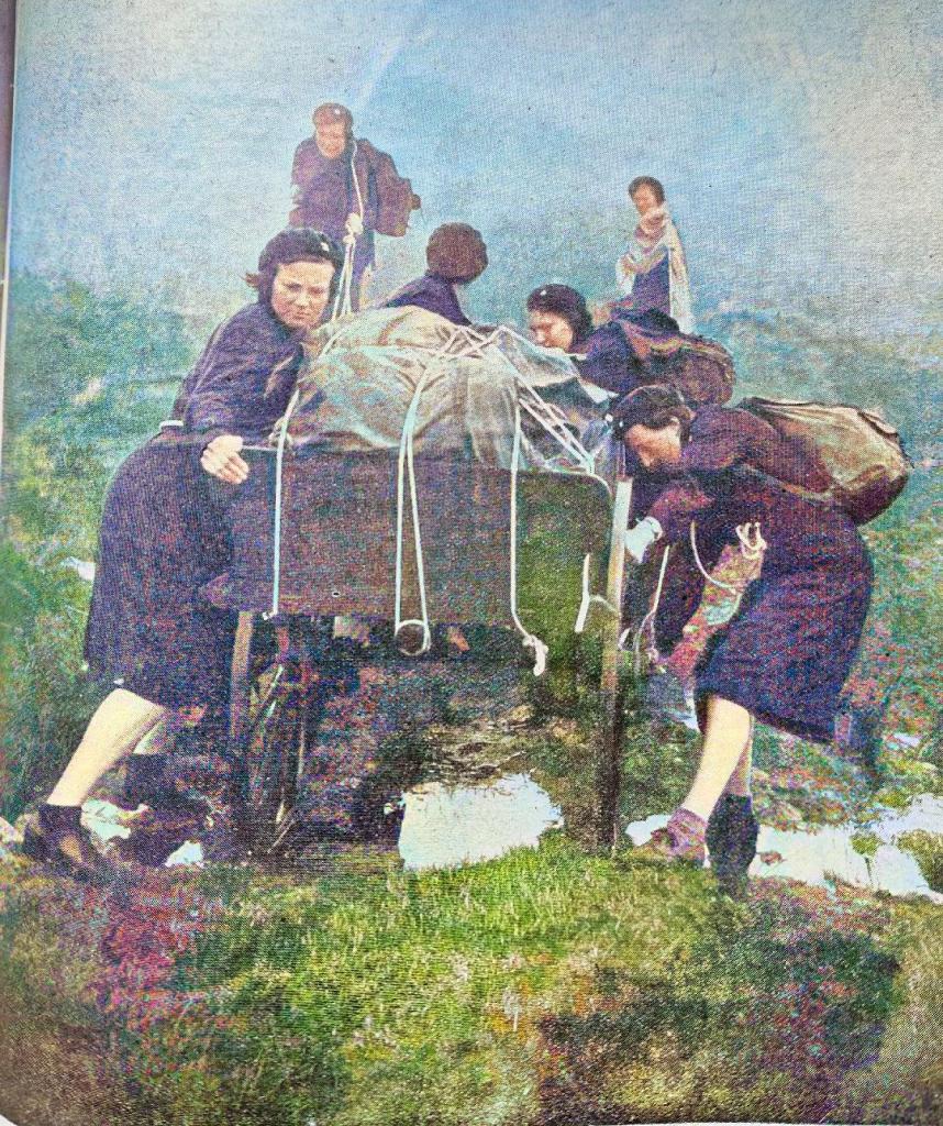 The first team set out in July 1944 to Greece. They tried to learn some of the language during the days on the voyage there, and once they arrived they found themselves involved in providing healthcare and supplying clothing rations to villagers in remote areas, often travelling on foot over mountain passes, the clothing bundles being carried on pack mules. They were soon spotted by local Guides, who saw and recognised the trefoil badge on the sleeve of the army tunics the volunteers wore, and these local Guides became involved in supporting the work as helpers and interpreters.