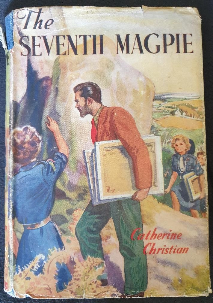1950 – Winifred Scott – Girl Castaways – Pickering & Inglis. Sea Rangers Audrey and Monica spot an unusual yacht on their way to Muster, then on their way home hear splashing and voices at the bottom of the cliff, as if men have landed there by fishing boat. The next day they head off early to explore, and find the yacht gone. Having abseiled down the cliff they head into the cave, through several tunnels to a cavern. Near the cave entrance they find a hut and, the door being unlocked, they go in, and explore it, finding a radio. When they turn to leave they discover they’ve been followed – facing them is a man pointing a gun . . .