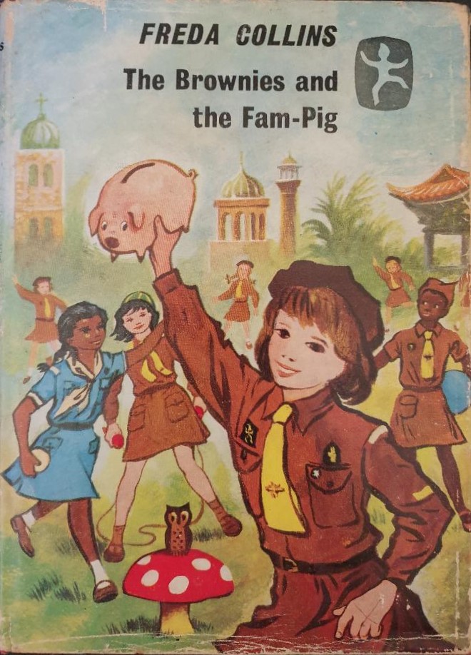 1964 – Freda Collins – The Brownies and the Fam-Pig – Knight Books. The book is a combination of a story, interspersed with articles, crafts and recipes. The story element tells of a Brownie Pack who obtain a china pig and try to fundraise in order to fill it with money to donate to Oxfam, the Oxford Committee for Famine Relief. During their fundraising efforts they pay imaginary visits to some of the countries they are fundraising for . . .