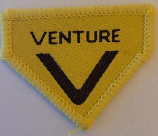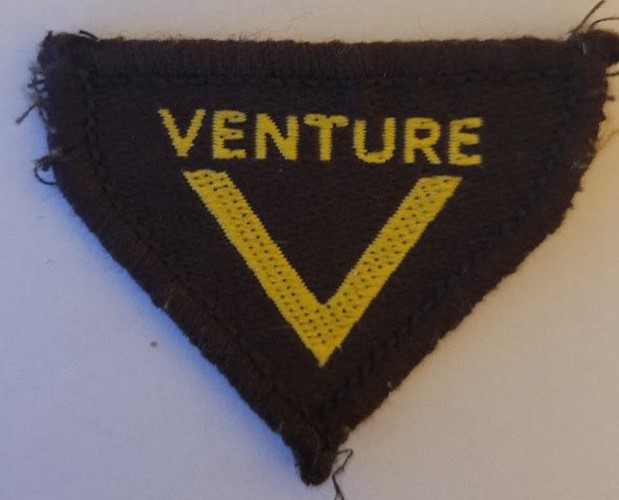 Brownie Venture Badge. 1968 – late 1980s. For participation in a pack project. Replaced by the triangular-shaped badge in brown. Initially there were stick-on numbers to designate how many ventures a Brownie had participated in, but these were dropped due to laundry issues.