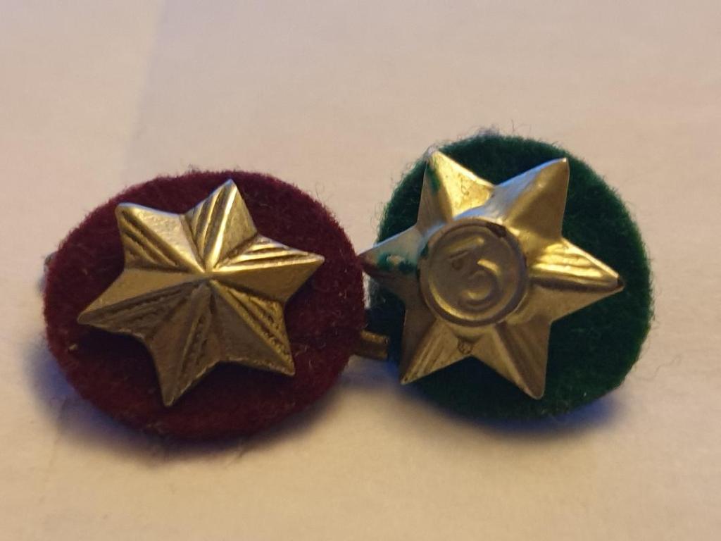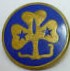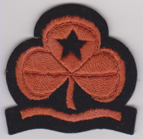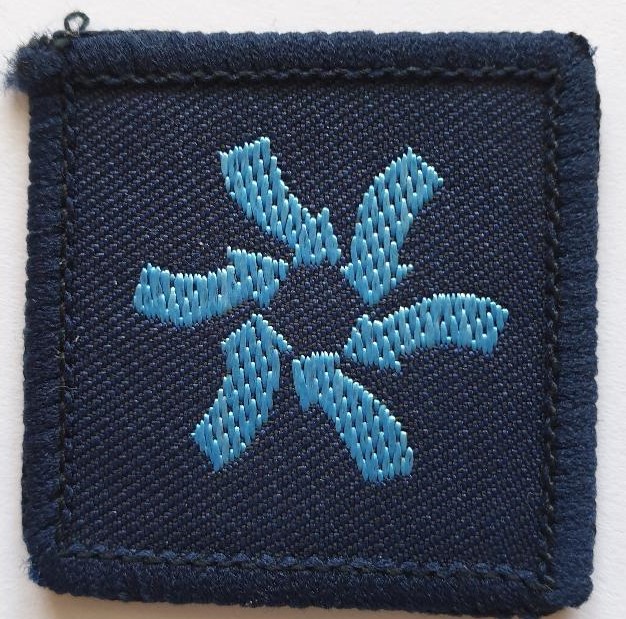 Service Star – in use c1910-1968. They were worn on felt disks – brown for Brownies, green for Guides, dark red for Rangers, Navy for Guiders. Initially they were all numbered, later a larger star was introduced to indicate 5 years, with smaller stars for single years, to reduce the number of stars worn. They were worn above the shirt pocket, the fastenings being originally a ring which was pushed through the shirt fabric and secured by a mini kirby-grip type clip, later replaced by a split-pin type fastening.