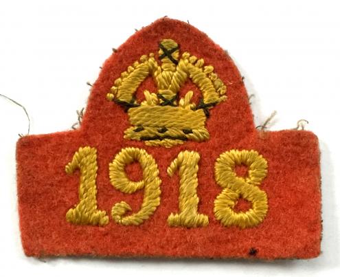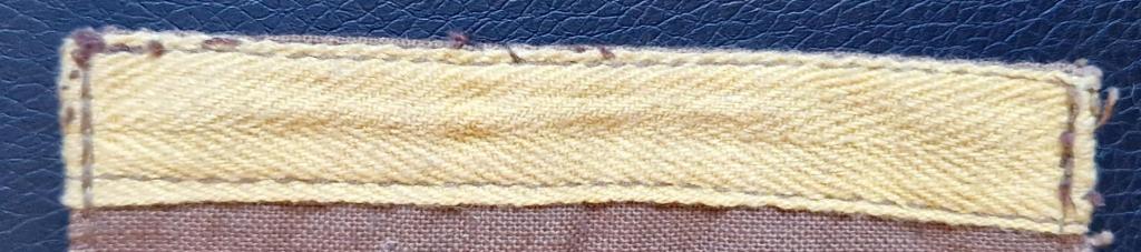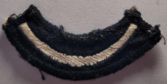 Guiding War Service Badge from WW1, given for a set number of hours of war work, or a set list of garments knitted. Separate badges were produced for each year, and examples of multiple year strips being worn below an upper badge exist. It was decided in 1921 that War Service badges from WW1would be removed from uniforms.