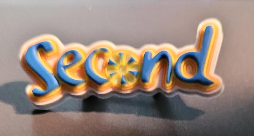 Brownie Sash Pin 2020s. Introduced with a new logo, with a rubber front rather than metal. Sash pins were later replaced entirely by a different fastening system where the ends of the sash were interwoven.