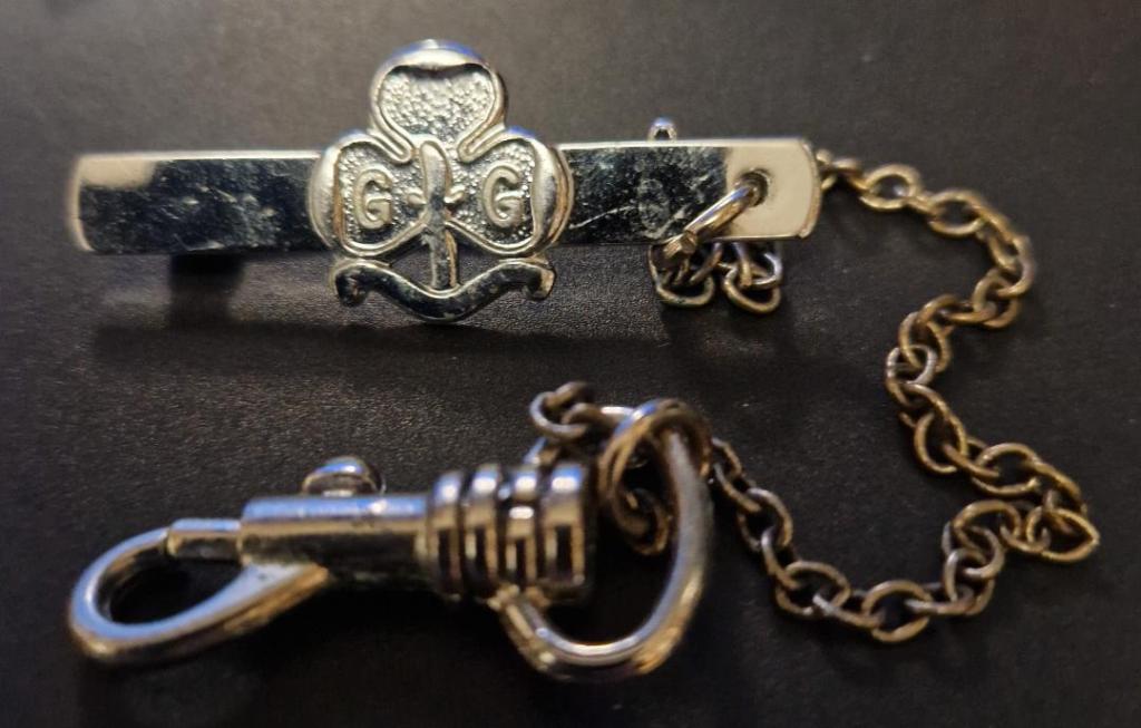 Sash Pin – 1990 – 2000s. Introduced in 1990 with the new uniform, for Brownies and Guides. Versions were produced with and later without the chain. The chain was used to attach the sash to a D-ring on the culottes, or Guide trousers – not for whistles/penknives as has been suggested. This style was withdrawn when the organisation’s logo changed.