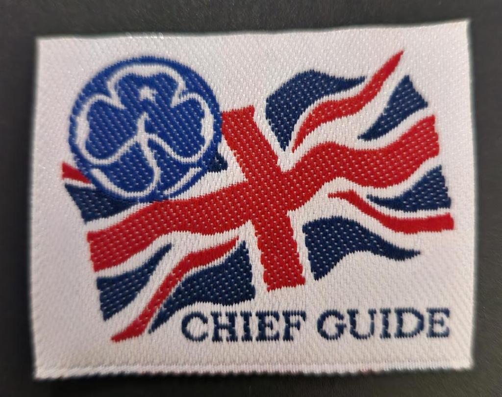 From the 2000s, each of the Chief Guides commissioned badges which could be handed out to people who met them. This early example was in ribbon, later ones were produced in woven form.