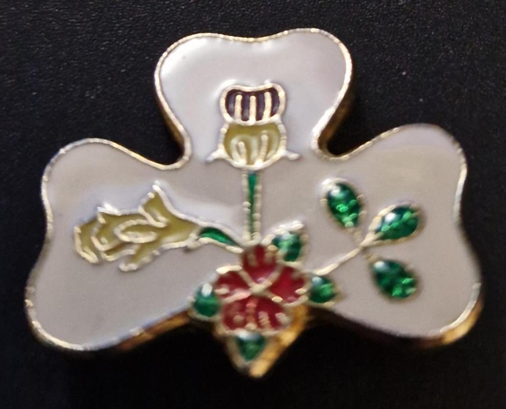 UK Friendship Badge, not worn in uniform but could be used for swapping or sharing internationally, available in metal or cloth. Featured symbols for each of the four UK countries – the red rose for England, the daffodil for Wales, the thistle for Scotland and the Shamrock for Ulster.