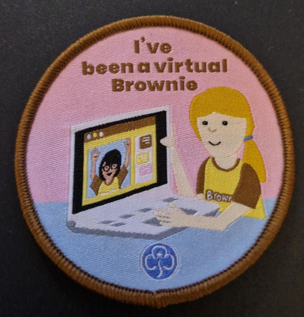 From March 2020 through to Autumn 2021, Britain was affected by the Covid virus, and as a result, units were forbidden from meeting in person throughout most of the time. Some Brownie units were able to meet via videoconference, and these fun badges were produced to commemorate this.