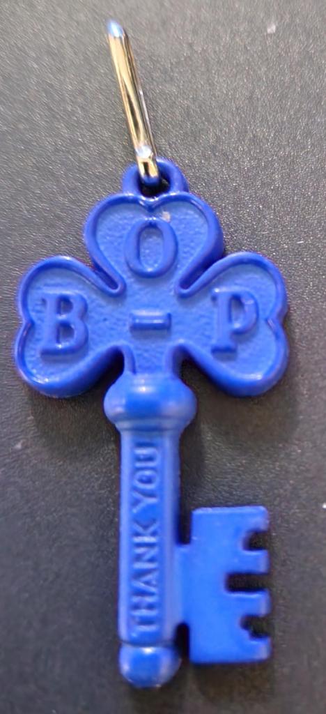 Produced in the early 1980s, the keyring charm was made in blue plastic and sold as an early fundraiser towards the building of a new World Centre and World Bureau in London. It finally led to the building of the World Bureau and Pax Lodge in Hampstead, London, following the closure of Our Ark/Olave House.