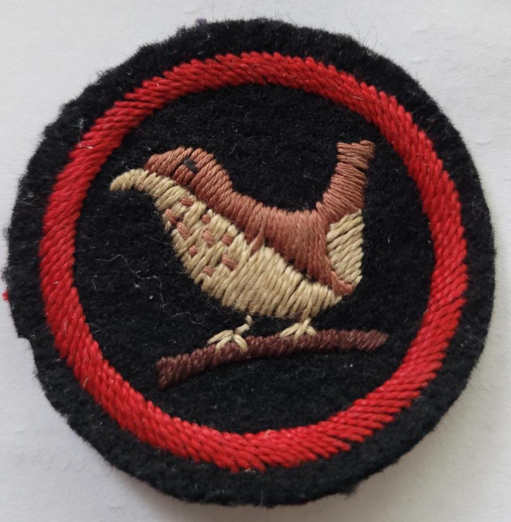 It’s also worth noting that originally, the Patrol badges were produced in a felt-like fabric which was unbound – although the stitching may look handmade it was almost certainly machined as standard. By the 1950s, they were produced as bound woven badges, which were more durable in laundry. The Patrols were: Bantam, Blackbird, Bluebell, Bluetit, Bullfinch, Buttercup, Buttercup & Daisy, Canary, Chaffinch, Clover, Cornflower, Daffodil, Daisy, Forget-me-Not, Fuchsia, Hawthorn, Holly, Honesty, Iris, Kingfisher, Lily, Lily of the Valley, Marguerite, Mistletoe, Nightingale, Orchid, Pansy, Poppy, Primrose, Purple Heather, Red Rose, Robin, Scarlet Pimpernel, Shamrock, Skylark, Snowdrop, Speedwell, Sunflower, Snowdrop, Thistle, Thrush, Violet, White Heather, White Rose, Wren.