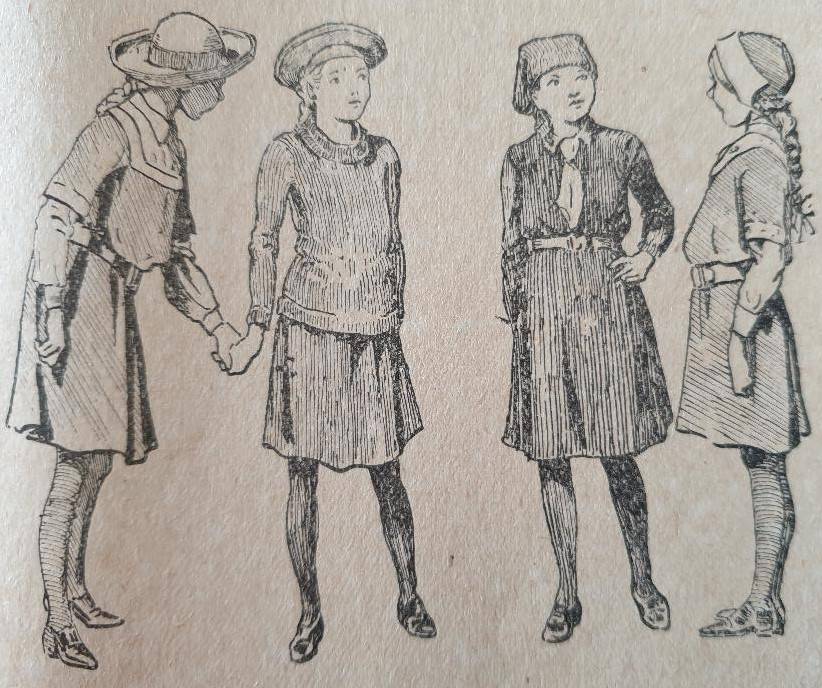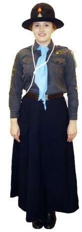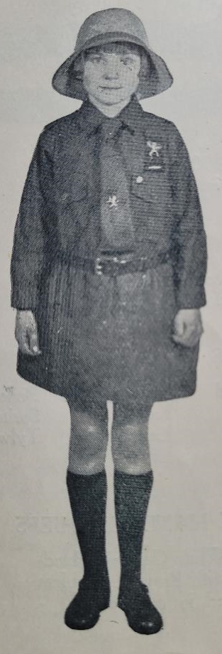 Tunic – Brown or Navy blue with patch pockets (or Jersey and kilted skirt). Knickers – Brown or Navy blue. Cap or Hat – Knitted cap or Rush hat with brown ribbon band. Belt – Brown leather. Tie – Brown triangular. Shoes and Stockings – Brown. Hair Ribbon – Brown. Badges – Worn on left breast.