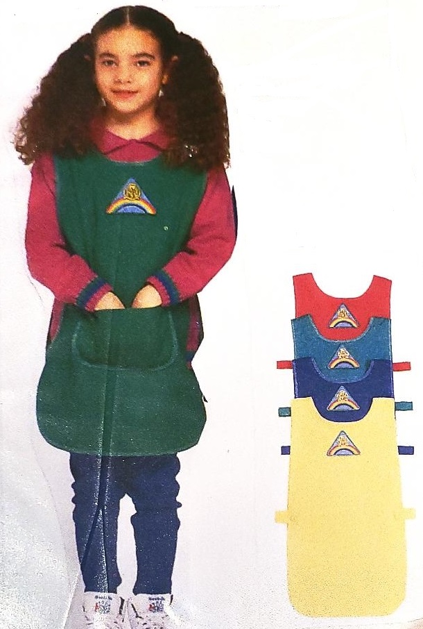 In the mid-1980s a proposal for a younger section before Brownies was launched in mainland Britain. Various pilot groups were set up in different localities, and each faced the question of uniform. As these groups often met after school, a full change of clothes was not convenient – so most of the groups opted for some form of coloured tabard to wear over the day-clothes the girls already had on, and which would serve as an apron too.