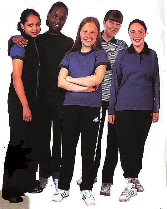 Grey hooded sweatshirt with ice blue trim or Ice blue hooded sweatshirt with aqua trim and aqua zip-neck top with grey polo collar and light blue sleeves or Light blue blouse with aqua collar-lining. Badge tab with grey, aqua and ice blue vertical stripe. Worn with trousers or skirt.