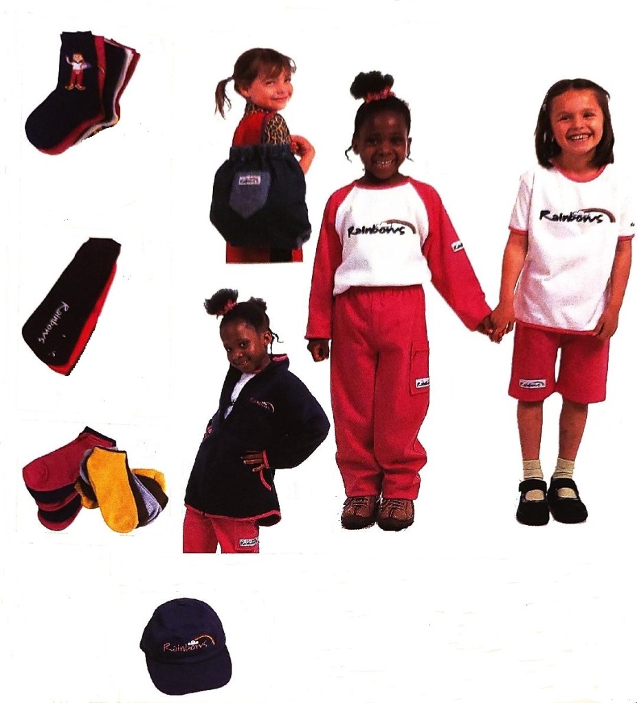 August 2004 – New Rainbow uniform introduced, designed by Ally Capellino. “The existing tabard will become an optional item – however the yellow and orange tabards will no longer be available due to a lack of sales.” The items were a Rainbow hooded jacket in red with light blue trim, polo shirt in pale blue with red collar and sleeves, cycle shorts in red with light blue trim, joggers in red with light blue trim, and red baseball cap, all with the new Rainbows logo. So at last after much campaigning by Leaders, the Rainbows, too, had a mix-and-match uniform.