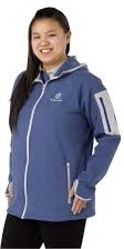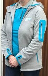 Light-blue long-sleeve blouse with aqua inside collar trim or Aqua polo shirt with grey collar with Grey zip hoodie with aqua trim and Grey badge tab.