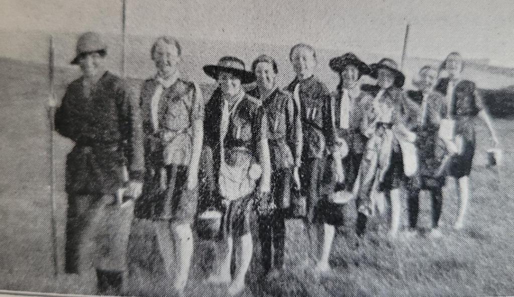 Before there were Guides, there were Girl Scouts. And just as they adapted all the other parts of the Scout programme as necessary, so they also adapted the uniform instructions, often teaming the khaki Scout shirts and hats with their usual navy shin or ankle-length skirts. They proudly carried their shoulder-height Scout Stave, with the end marked in inches, and wore their haversack and rolled-up coat in straps on their back.