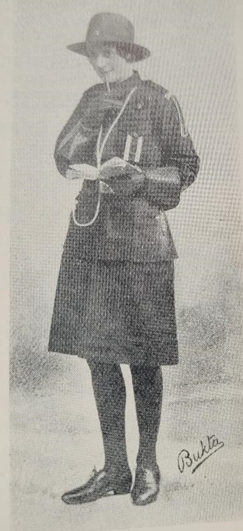 The Girl Guides’ Gazette of October 1915 gave guidance on uniform for Commissioners: “The Commissioner’s uniform (optional) consists of shirt blouse, pale blue tie, regulation skirt with 2 pockets, regulation coat with 4 pockets, whistle cord on right shoulder to pocket, ordinary officer’s brown belt, commissioner’s silver cords on left lapel and shoulder with badge, soft leather gauntlet gloves.”